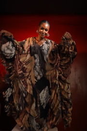 This chiffon fabric kaftan with earthy tones and flowing ruffles evoke the movement of desert, perfect, airy and elegant.
